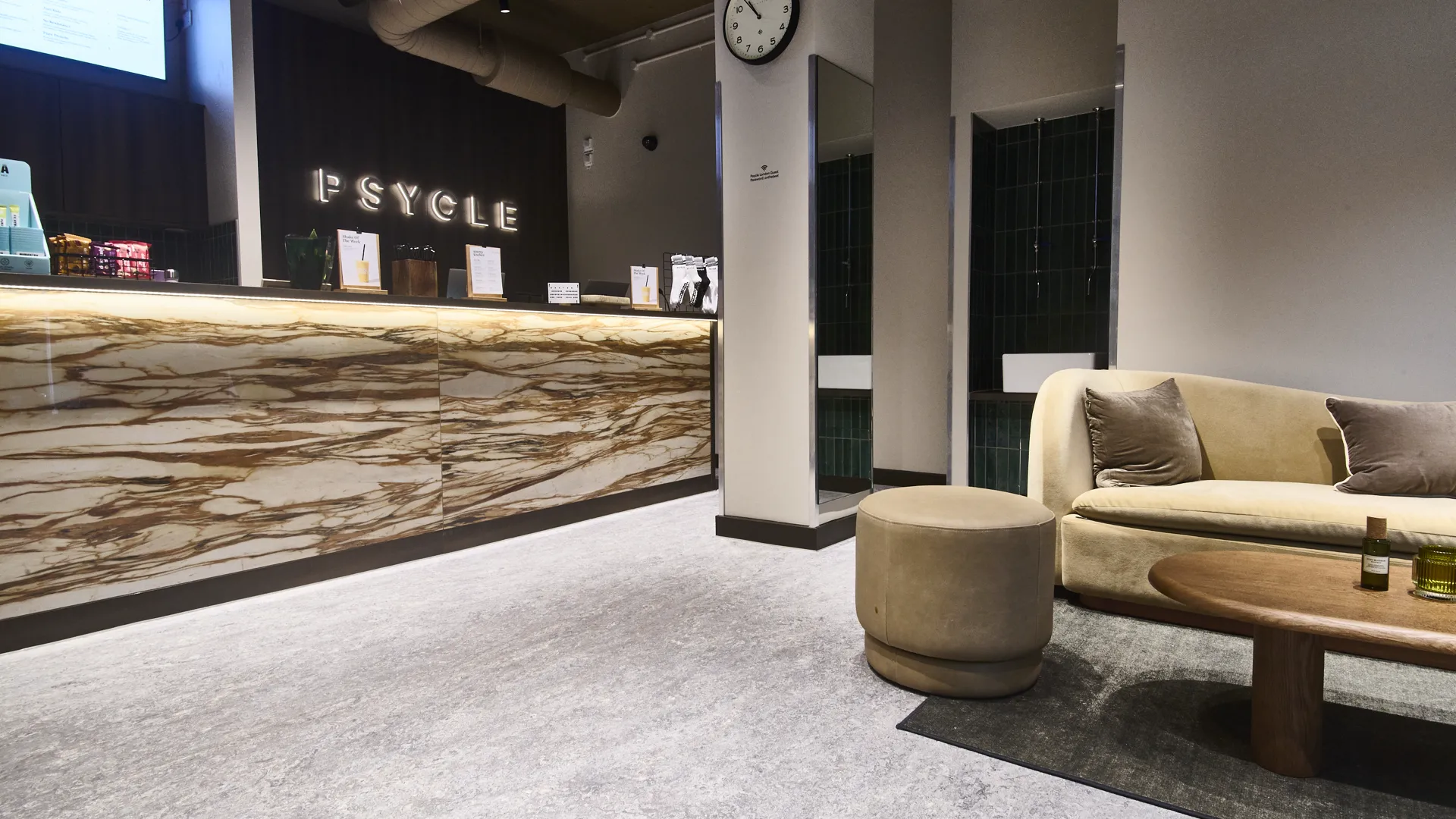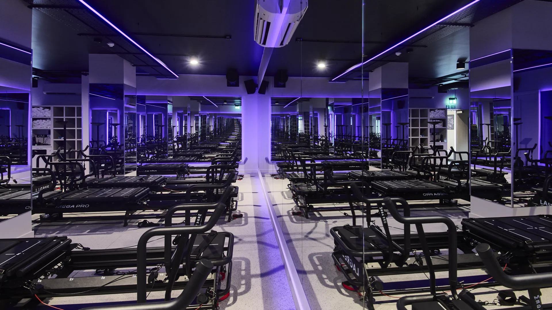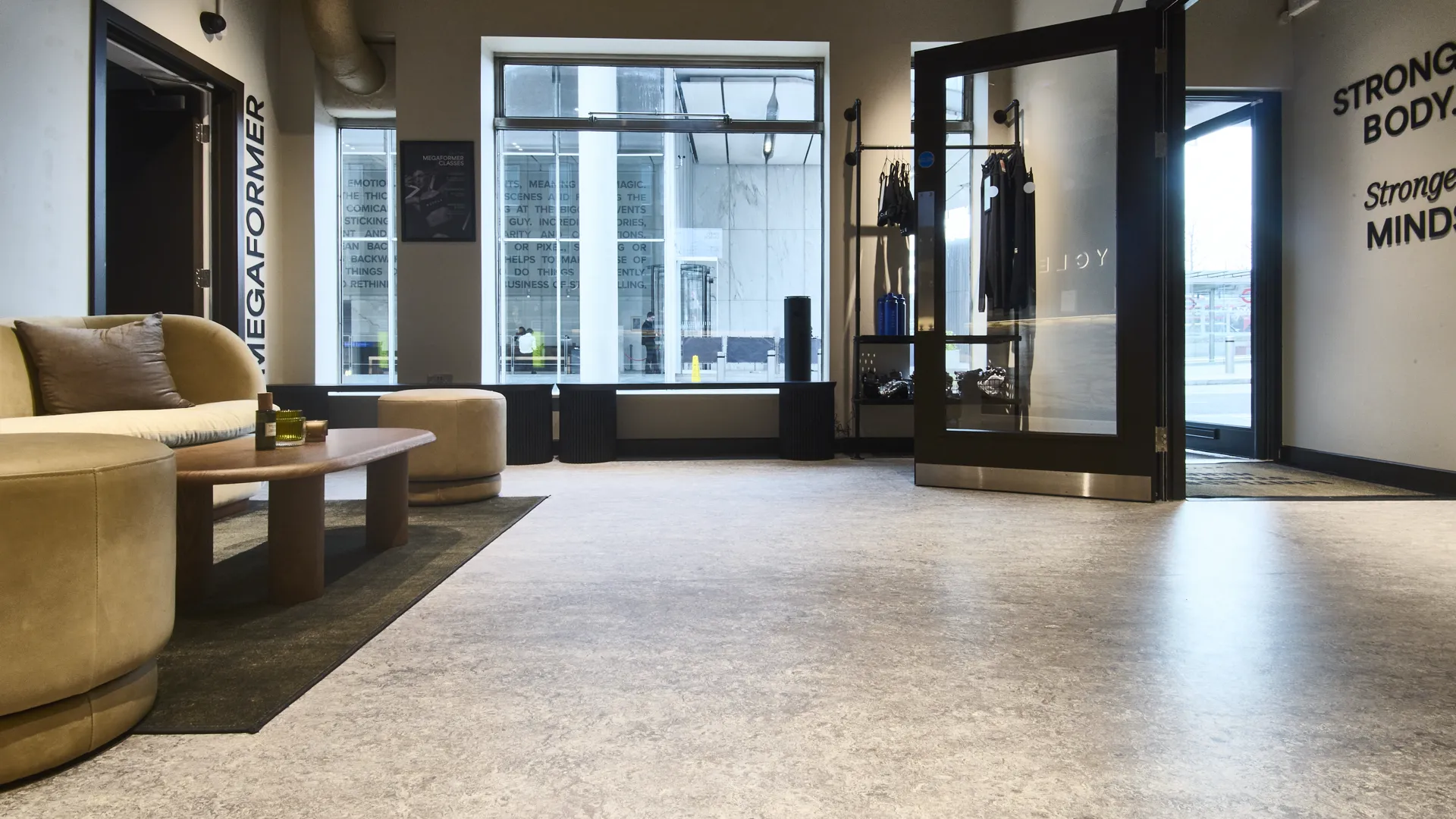 The Megaformer studio received 20mm Fitness Tile in the Snowflake finish, creating a bright, premium space for intensive daily training.